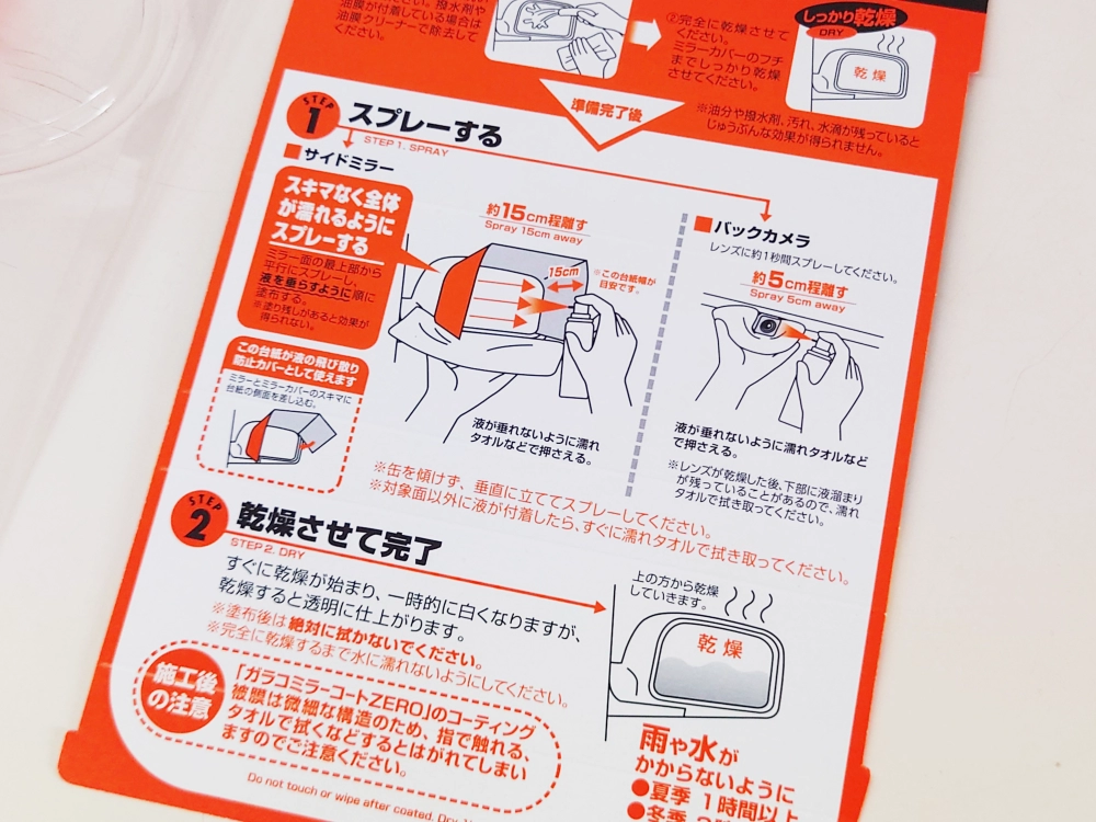 ガラコミラーコートZEROを車のサイドミラーに施工する場合は15cmほどはなしてスプレーするということ。
