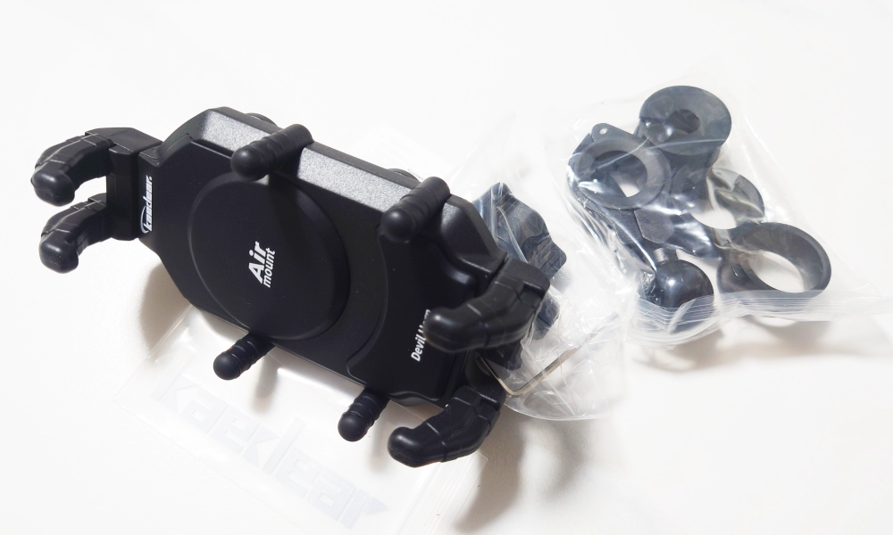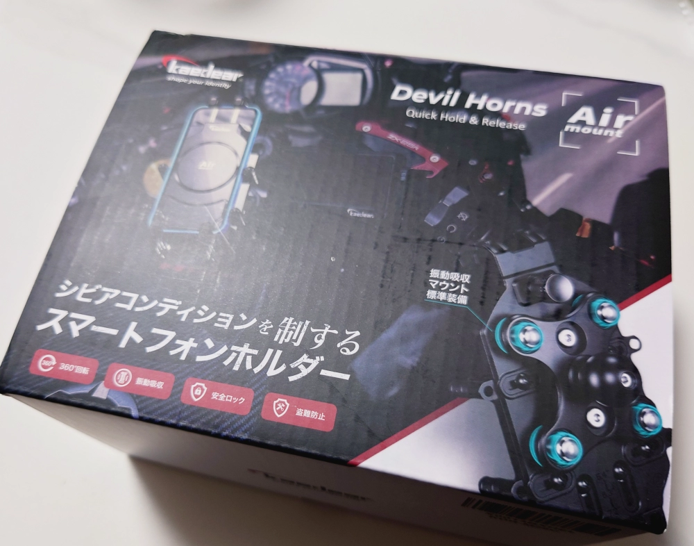 もう箱の時点でしっかりした製品感が伝わってくるカエディアの「デビルホーン AirMount KDR-M26C」、シビアコンディションを制するスマホホルダーとかアピールしてある…やっぱ高いだけあります。