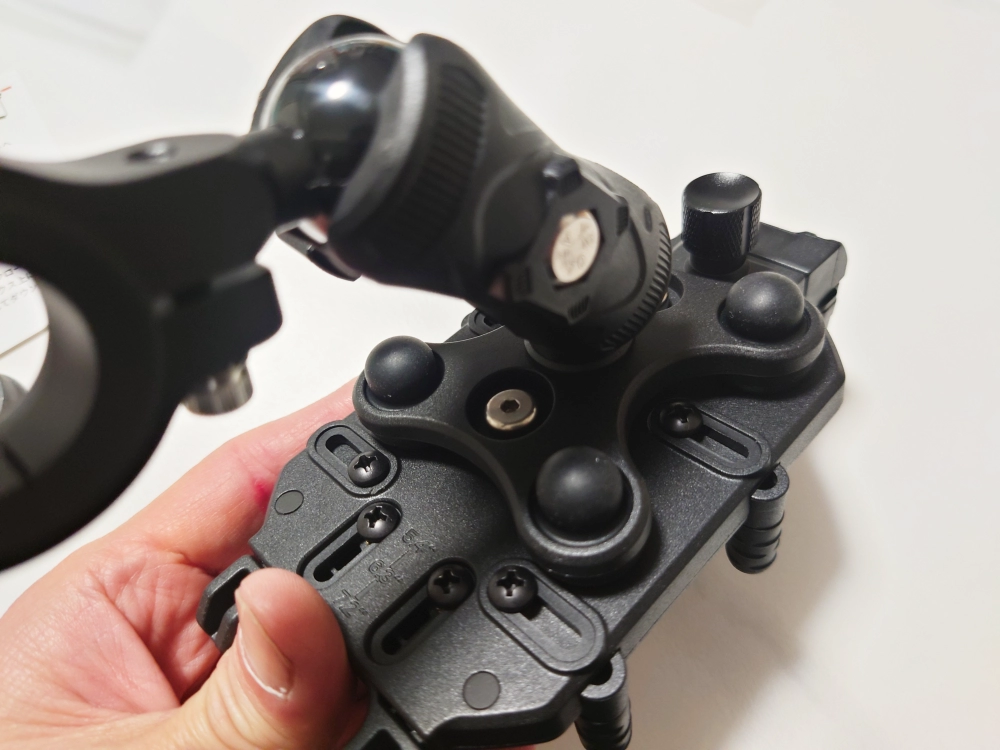 ネットで検索してみるとカエディアの「デビルホーン AirMount KDR-M26C」の重量は375g、アルミニウム合金のマウントと強化プラスチックで作られているということ。